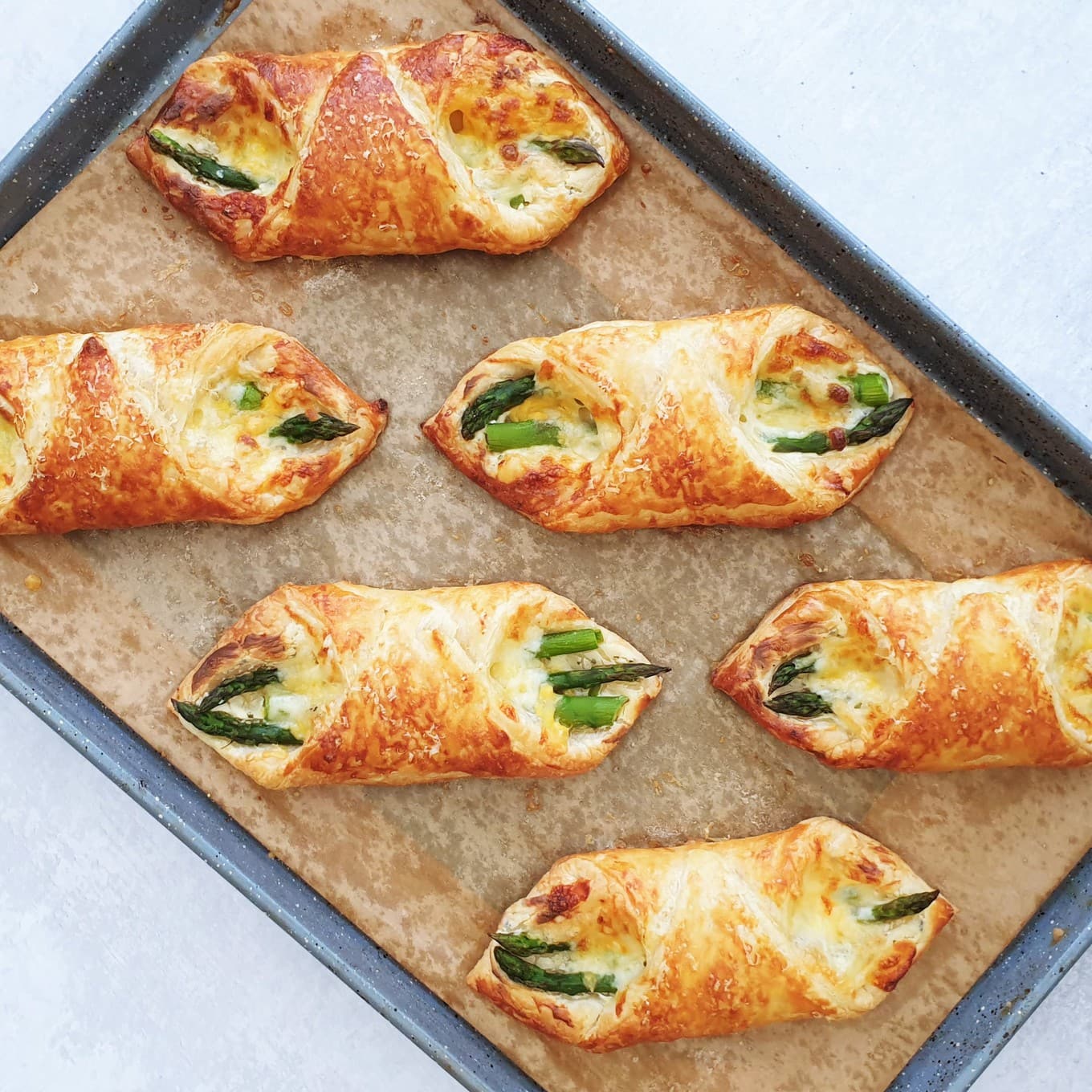 45g Garlic Place 3 asparagus spears on each smear of cream cheese. Finely grate 2 tbsp Parmesan over the pastry after it has been thoroughly coated. You should cover the exposed pastry with egg wash. Preheat the oven to 350 degrees Fahrenheit for 15 minutes.