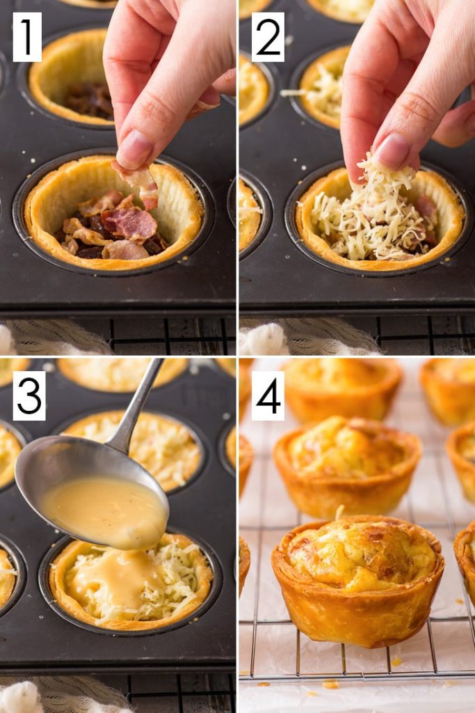 In a mixing bowl, combine the eggs, milk, cheese, salt, and pepper until well combined. Flour the muffin trays and place shortcrust pastry on top. Allow the filling to bubble up and cook through, then firm up, after 15-20 minutes in the baking pan.