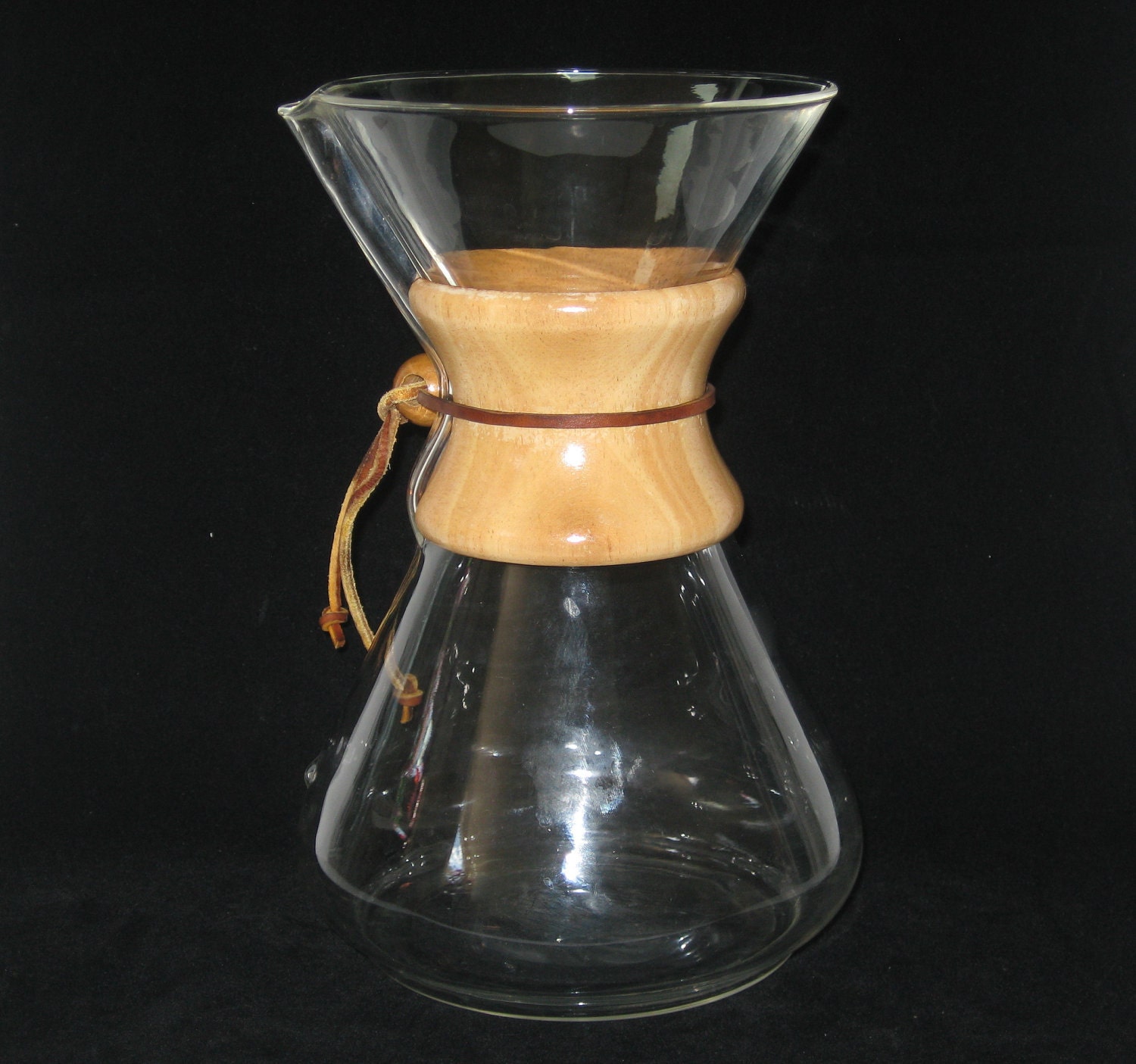 The Chemex Coffeemaker is a manual pour-over style glass coffeemaker, invented by Peter Schlumbohm in 1941 and manufactured by the Chemex Corporation in Chicopee, Massachusetts. A Chemex brewer can be used for three cups, one pint, three cups, six cups, 30 ounces, five cups, eight cups, 40 ounces, eight cups, ten cups, fifty ounces, thirteen cups, or one gallon. The Chemex is a handcrafted glass coffee maker that is small enough to fit easily on a kitchen counter and has a hand blown glass finish. According to Perfect Daily Grind, the Chemex brewer is built on the principle of “laboratory apparatus.” The Modern Museum of Art displayed the design as one of the best new works in 1943 and it eventually made its way to the permanent collection. Because the Chemex was designed as a manual pour-over brewer, the coffee is brewed by pouring hot water over ground coffee, allowing the user to control how the coffee is brewed. The Chemex comes in imperial sizes (US) or 3-cup, 1 pint, 3-cup, 6-cup, 30 ounce, 5-cup, 8-cup, 40 ounce, 8-cup, 10-cup, 50 ounce, 13-cup, 50-cup, and 46 ounce.